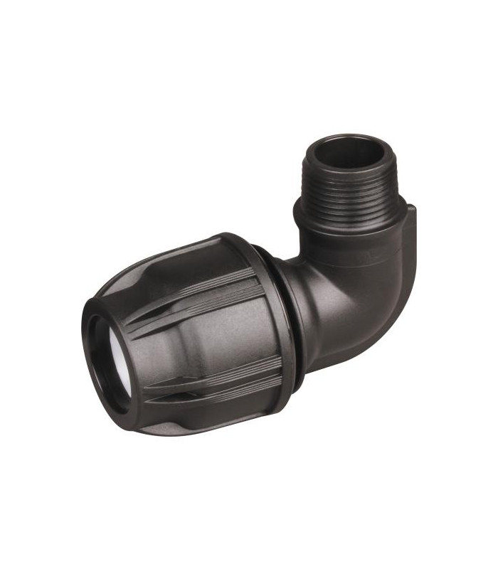 Elbow connector (90°) with 25 mm connection and 3/4" male thread, designed for irrigation and watering systems.
