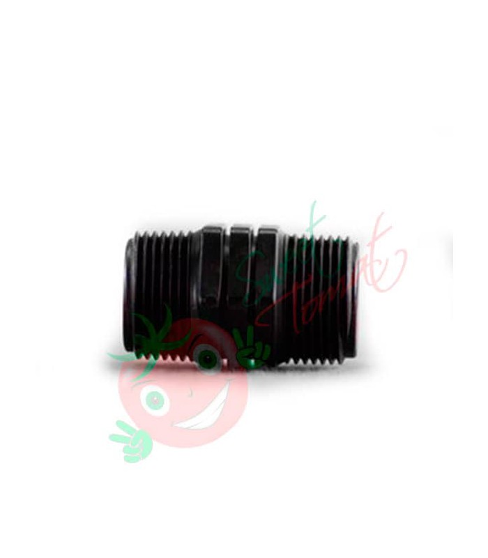 Kobling laget av hard plast med to utvendige mann gjenger på 1" på begge sider.