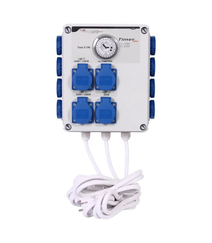 GSE TimerBox 12x600W er en kraftig og praktisk timerboks for sikker styring av vekstlys i dyrkerom, telt og drivhus. Den gjør det enkelt å slå av og på flere lamper samtidig og sørger for stabile lysperioder gjennom hele dyrkesyklusen.