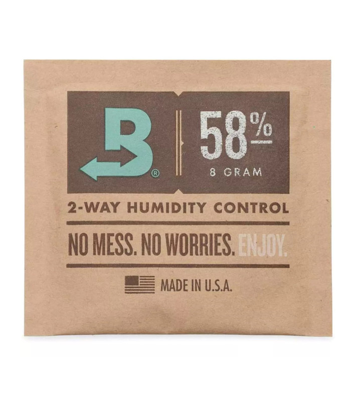 Boveda 58% 8g er en kompakt toveis fuktighetsregulator som holder stabil relativ luftfuktighet på 58% i små lufttette beholdere.